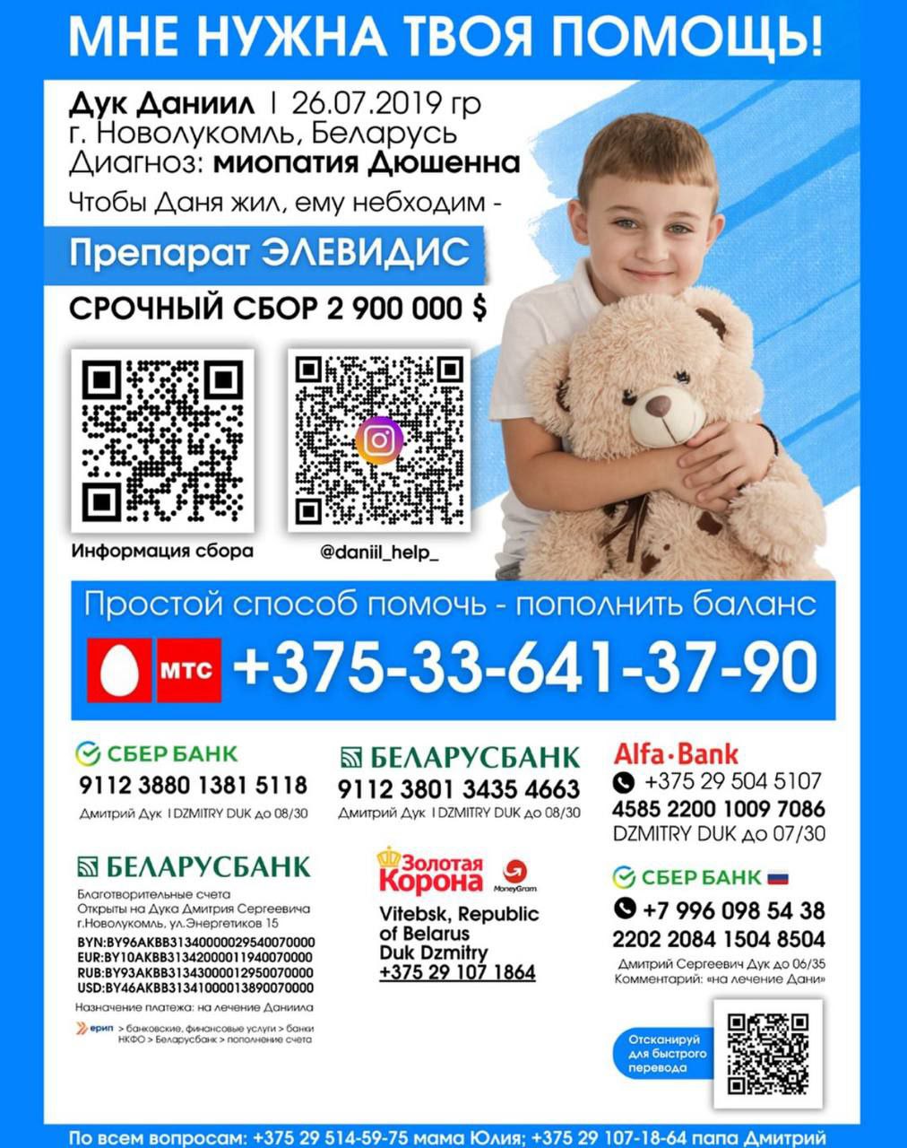 Дети с таким заболеванием лишаются возможности сидеть, стоять, двигаться, глотать и дышать. Те, у которых заболевание проявилось еще в младенчестве, без лечения не доживают и до двух лет. В качестве лечения применяется самый дорогой препарат в мире ZOLGENSMA, стоимость которого очень высока — 2 274 031 долларов США. Срочность сбора состоит в том, что ZOLGENSMA применяется у детей только до 2 лет, у Ромы осталось очень мало времени для получения спасительного лекарства. Сумма неподъемная для меня. Страх потерять ребенка доводит до отчаяния. Я умоляю Вас помочь спасти жизнь Ромы! Пакет всех необходимых подтверждающих документов предоставляется по требованию. Я очень надеюсь на Вашу помощь. С уважением, Антихевич Елена Александровна — мама Ромы. Тел. +375 44 752 15 46 Благотворительные счета Центр банковских услуг 721 ОАО «АСБ Беларусбанк» — г. Мстиславль, ул.Интернациональная, 24; УНП 100325912; МФО AKBBBY2X.